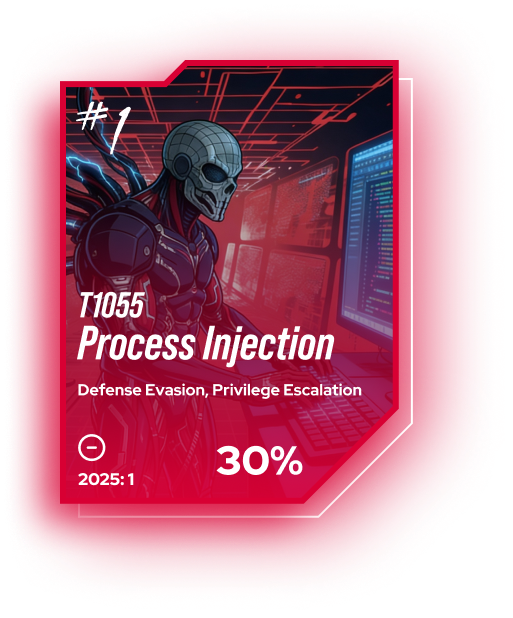 The most prevalent ATT&CK techniques identified in 2025 are ranked by the percentage of malware samples exhibiting each behavior. Click on a technique to explore its details: how to simulate it (red team exercise), how to detect and mitigate it (blue team exercise), and which threat actors and malware leverage it against specific targets.