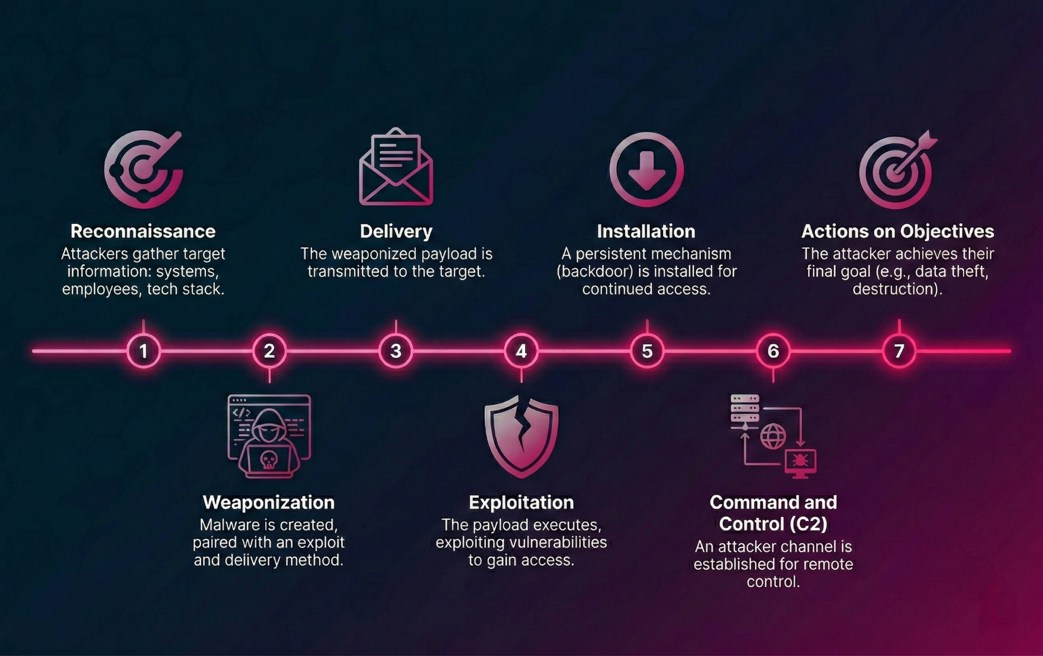 A breach unfolds over time, never just one sudden event. Step by step, intruders advance, yet every stage opens a window for detection. Each move they make reveals something useful. Here are the 7 steps of the Cyber Kill Chain: