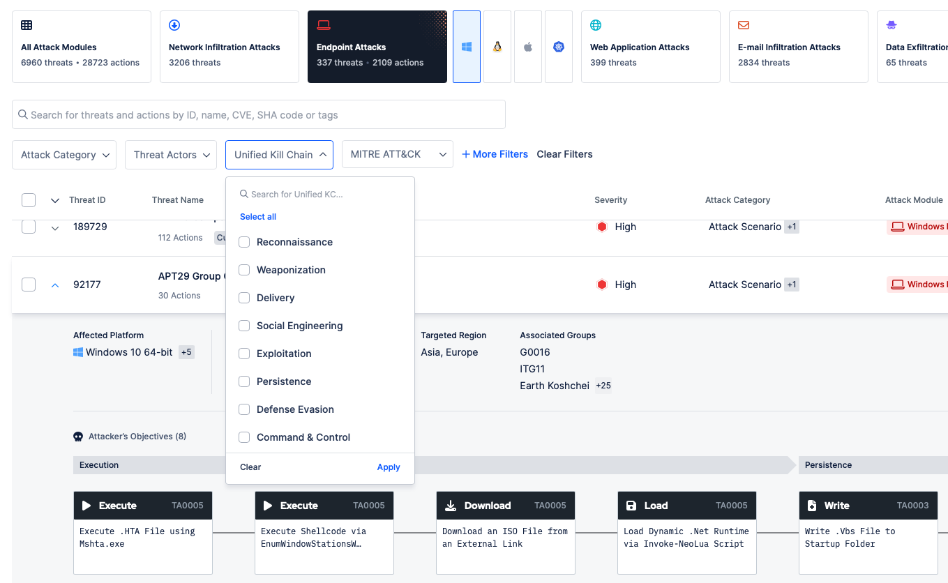 For teams that prefer a kill-chain perspective, Picus also supports filtering by the Unified Cyber Kill Chain.