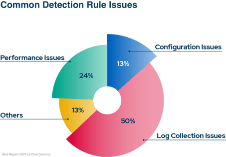 The Blue Report 2025 demonstrates this with empirical data: log collection issues accounted for 50% of detection rule failures, while misconfigurations and performance bottlenecks contributed 13% and 24%, respectively. These silent failures mean that even advanced controls can give the illusion of protection while allowing attackers to move laterally, escalate privileges, or exfiltrate sensitive data.