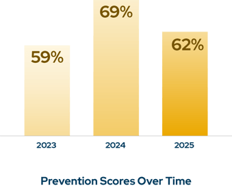 The Blue Report 2025 reveals that, while preventive controls continue to block a significant portion of attacks, their effectiveness has declined slightly, dropping from 69% in 2024 to 62% in 2025. This demonstrates that even when systems appear well-configured, they degrade over time due to misconfigurations, policy drift, and evolving attacker tactics.