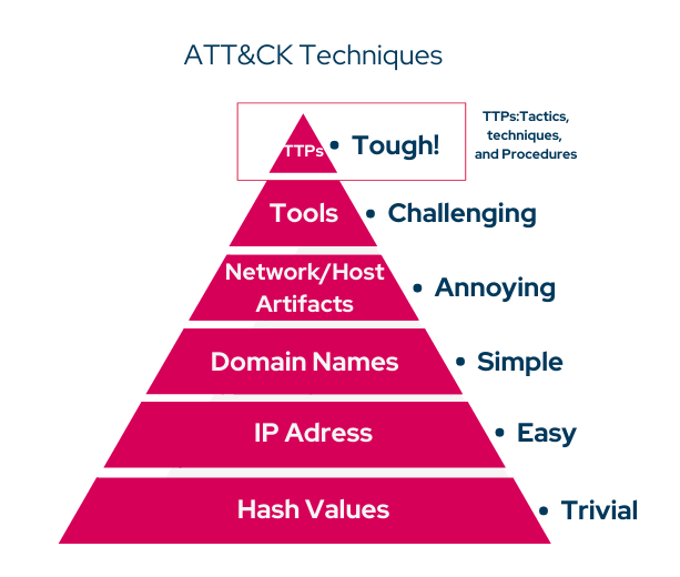 When a TTP is identified, adversaries must find and implement a new behavior, which is the most time-consuming activity. Identifying, detecting, and responding to a TTP forces adversaries to change their behavior, requiring significant time and monetary investment. |