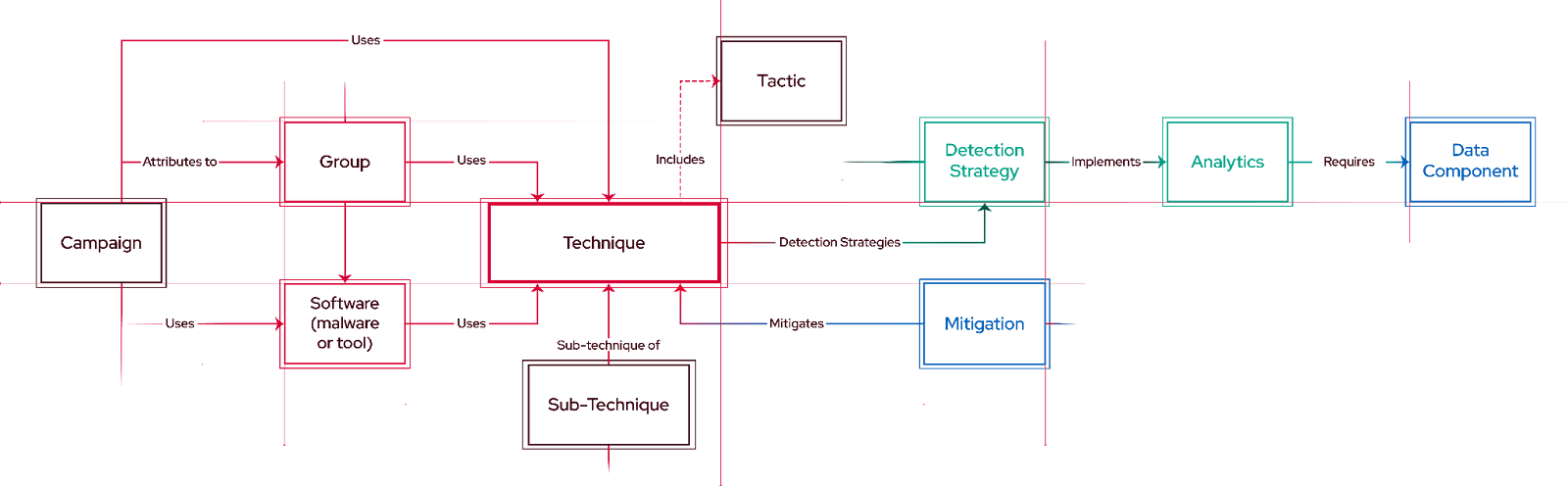 The above figure presents relationships between objects in the MITRE ATT&CK Framework. We explain these objects in the following sections.