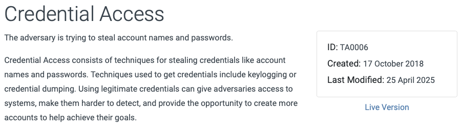 - Tactics: Name of the technique(s), in which the technique is categorized. For example, the tactic of the OS Credential Dumping technique is Credential Access, so adversaries use this technique to achieve Credential Access.