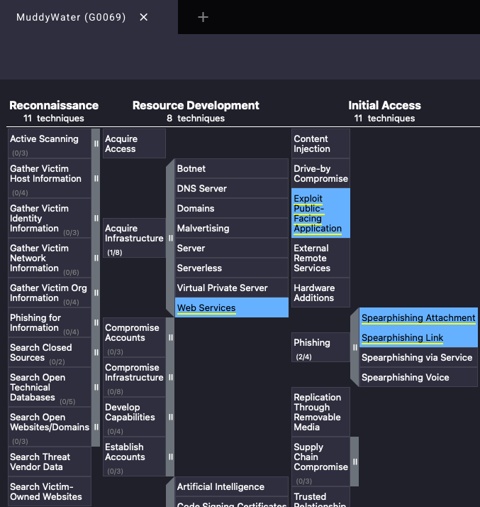 For each threat group, MITRE ATT&CK includes techniques used by the group and briefly describes how the group used these techniques. Furthermore, ATT&CK visualizes the techniques used by the group on the ATT&CK Navigator, as seen in the image below.