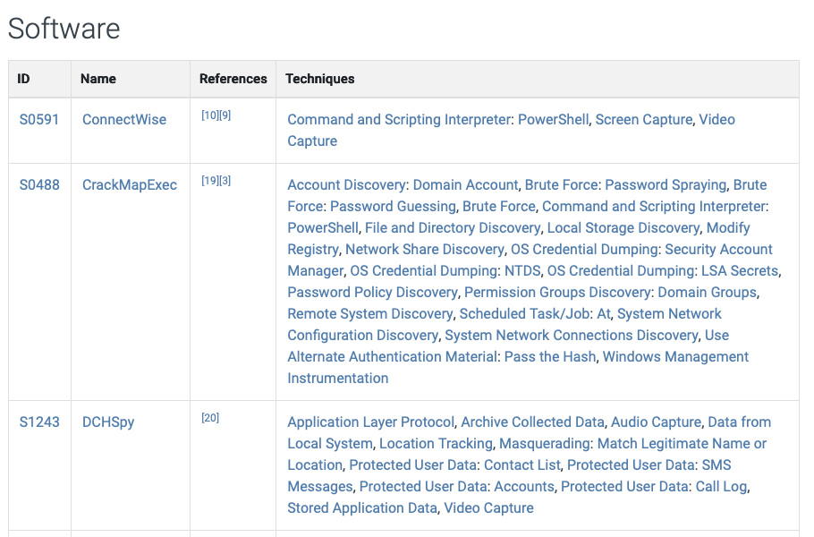 Aside from the ATT&CK techniques used by a threat group, the framework provides a list of Software used by the threat group, as shown in the image below. The software list for each threat group also includes the ATT&CK techniques used by the group.