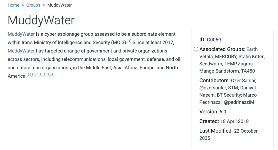 As seen in the screenshot, ATT&CK provides attribution of the group, targeted geographies, and targeted sectors. For example, the MuddyWater APT group is attributed to Iran, and it targets telecommunication, government, and oil companies in the Middle East, Europe, and North America.