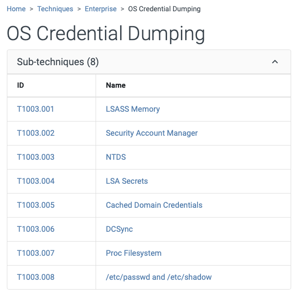 - Sub-techniques: IDs of sub-techniques of the technique. OS Credential Dumping technique includes eight sub-techniques identified by T1003.001, T1003.002, …, T1003.008. A sub-technique is a way to describe a specific implementation of a technique in more detail. Note that some techniques do not have sub-techniques, for example, the T1190 Exploit Public-Facing Application technique.
