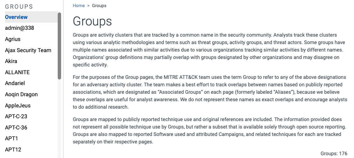 Groups are threat groups, activity groups, or threat actors related to an intrusion activity and are tracked by a common name in the security community. Currently, there are 176 groups in the MITRE ATT&CK Framework.