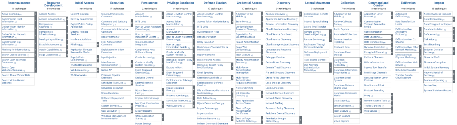 MITRE ATT&CK is not static. For example, in the October 2025 v18 release, six new techniques and six new sub-techniques have been added to the Enterprise matrix, and 62 techniques and sub-techniques have been updated. So, the framework expands as new techniques and tactics are observed and existing (sub-)techniques are updated. In the latest release (v18), ATT&CK for Enterprise contains 14 tactics, 216 techniques, and 475 sub-techniques. MITRE ATT&CK also provides threat groups that are related to an intrusion activity and the software utilized by these threat groups. MITRE ATT&CK uses the term software to define malware, custom or commercial tools, open-source software, and OS utilities that adversaries use. Currently, ATT&CK includes 176 groups, 784 software, 55 campaigns, 44 mitigations, 691 detection strategies, 1739 analytics, and 106 Data Components.