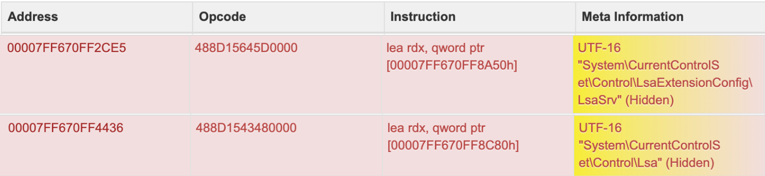 The "Hidden" attribute in the metadata suggests that the malware employs obfuscation techniques to conceal these registry changes from standard inspection tools, increasing its stealth. The lea rdx, qword ptr instructions prepare the registry key addresses for further operations, such as querying, modifying, or injecting malicious DLLs. This behavior aligns with common tactics where adversaries use the Lsa or LsaExtensionConfig keys to load their payloads, allowing execution within the trusted and elevated context of the LSA process.